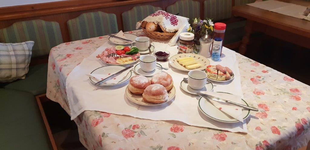 Auf Wunsch servieren wir Ihnen ein köstliches, umfangreiches Frühstück mit Produkten aus eigener Landwirtschaft wie Brot, Eier und Milch in unserem gemütlichen Frühstücksraum.